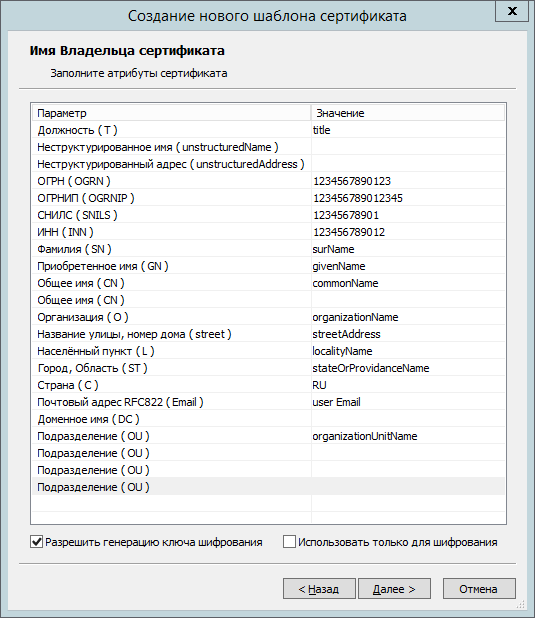 Заполните атрибуты сертификата для построения Имени Владельца сертификата, установите опцию Разрешить генерацию ключа шифрования, если требуется и нажмите Далее.