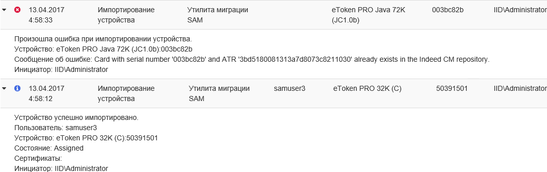 События успешности или ошибки переноса данных могут быть записаны в журнал на сервере Rutoken KeyBox.