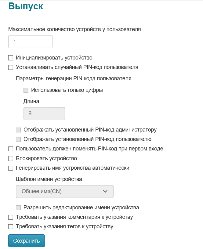 | Блокировать устройство | Если опция включена, то устройство будет заблокировано после выпуска. Перед использованием устройства, пользователь должен будет его разблокировать любым доступным способом (в режиме online или offline) и установить новый PIN-код. |