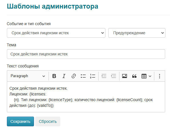 Например, в шаблон уведомления Срок действия лицензии истек встроен объект licenses с параметрами licenseType, licenseCount, validTo.