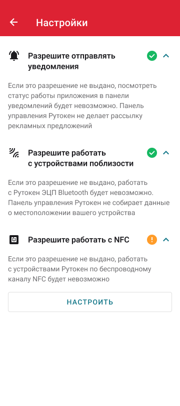 Также перед работой с устройствами по NFC убедитесь, что приложению выдано соответствующее разрешение в настройках.