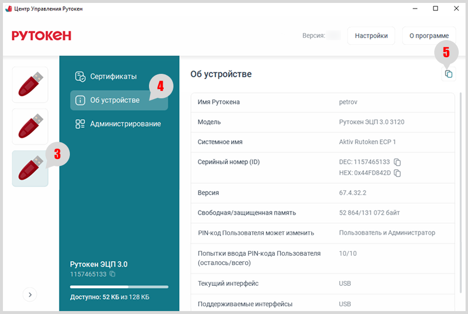Чтобы в скопированной информации была информация об оставшихся попытках ввода PIN-кода Администратора, перейдите в режим управления. Для этого:
