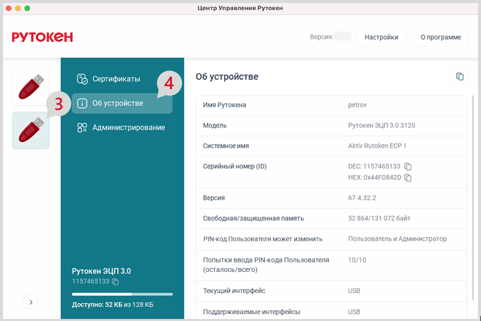 В результате отобразится информация о выбранном устройстве Рутокен.