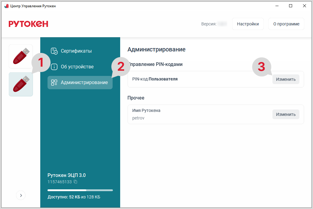 - На боковой панели для выбора устройства нажмите на нужный Рутокен.