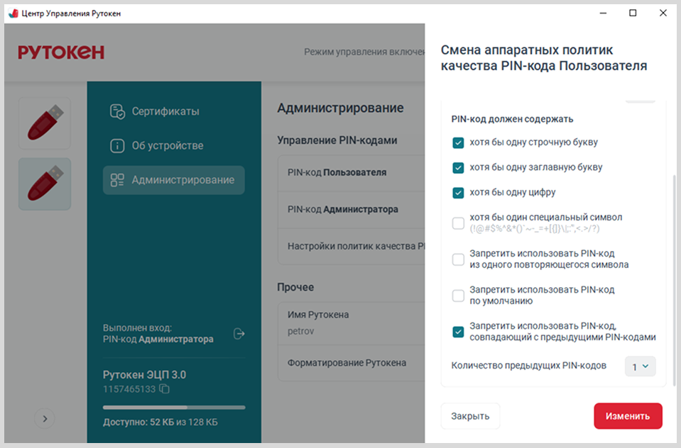 - В окне Смена аппаратных политик качества PIN-кода Пользователя укажите PIN-код Администратора.