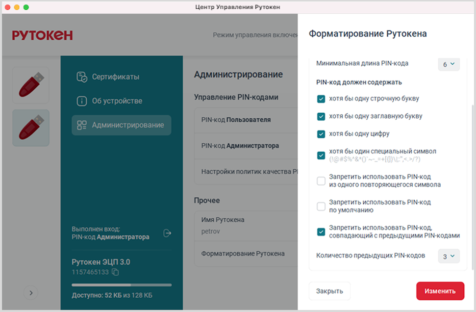 Если у вас Рутокен ЭЦП 3.0, то в процессе форматирования доступна дополнительная функциональность — смена аппаратных политик качества PIN-кода Пользователя. Чтобы их изменить: