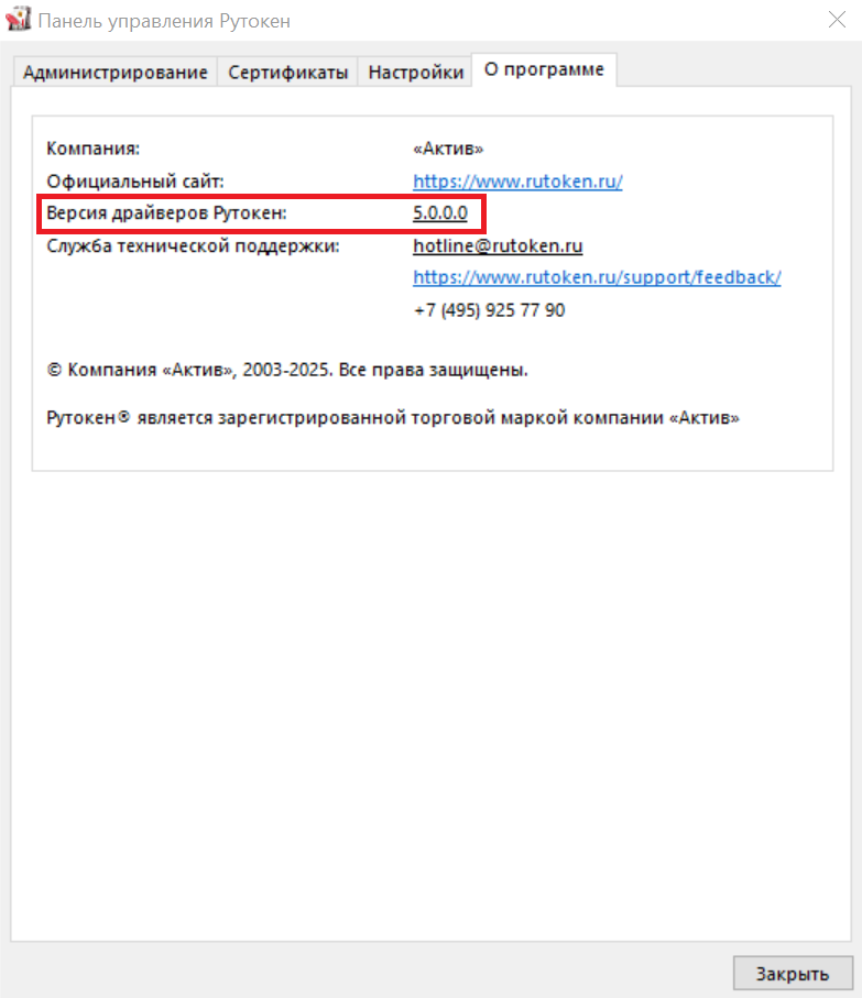 - Перейдите на вкладку О программе. В строке Версия драйверов Рутокен будет указана установленная на компьютере версия комплекта драйверов.