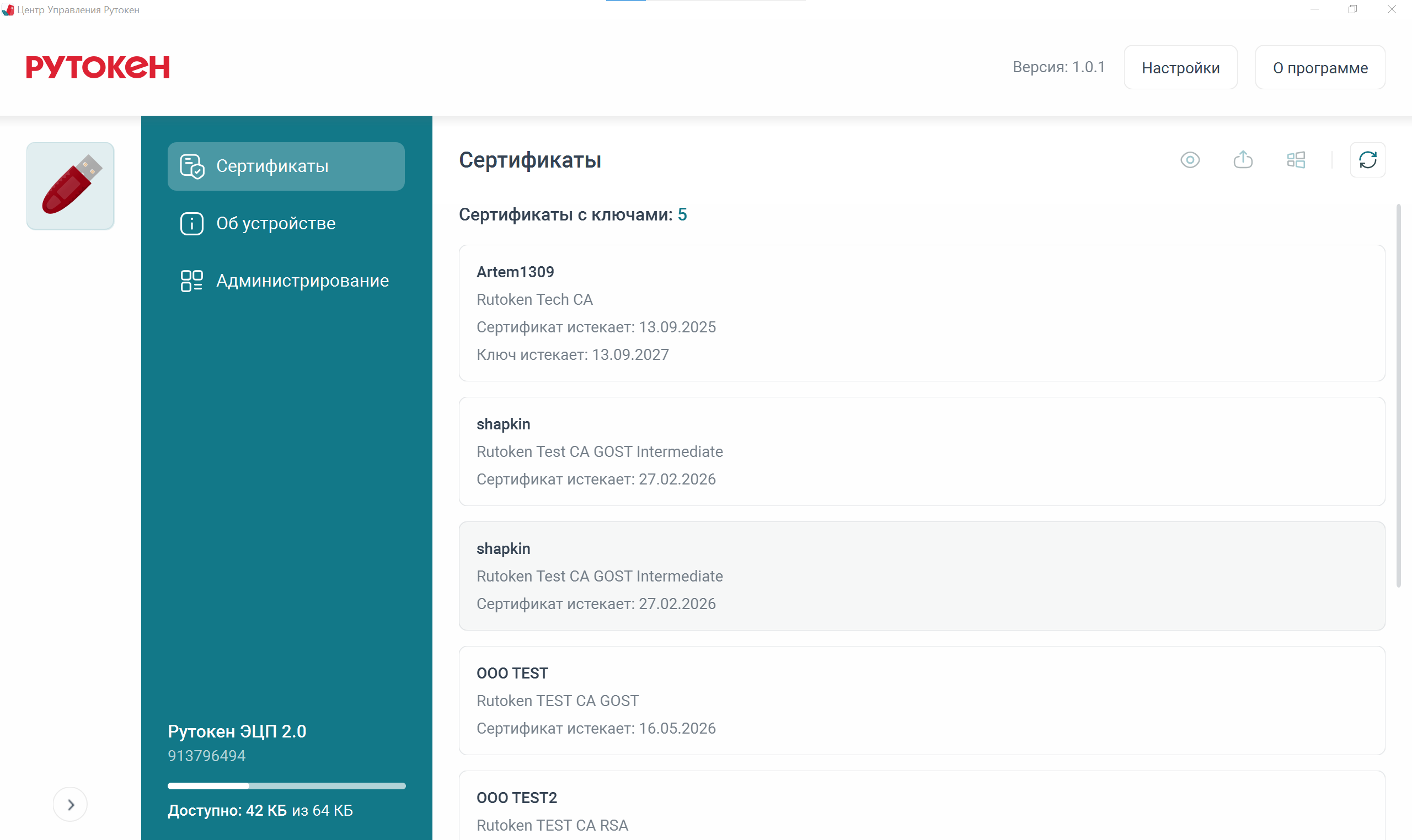 - Добавлен новый компонент – Центр управления Рутокен (ЦУР) – который устанавливается вместе с драйверами и Панелью управления Рутокен (ПУР). Это кроссплатформенное приложение для администрирования устройств Рутокен, которое в будущем заменит ПУР. Приложение поддерживает устройства Рутокен ЭЦП 3.0/2.0 и Рутокен Lite.